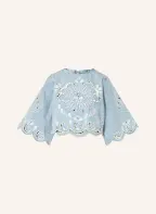 FARM RIO Cropped denim blouse with openwork lace and 3/4 sleeves: LIGHT BLUE / WHITE