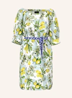 Das knielange Baumwollkleid besticht durch einen mediterranen Zitronen- und Oliven-Print. Der flexible Carmenausschnitt ermöglicht verschiedene Tragevarianten, während dreiviertellange Ärmel mit Raffungen an den Enden modische Akzente setzen. Ein gerundeter Saum mit kurzen Seitenschlitzen sorgt für Leichtigkeit und Bewegungsfreiheit. Praktische Eingrifftaschen runden das Design ab.