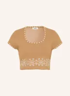 SANDRO Cropped-Strickshirt mit Lochspitze: CAMEL / WEISS