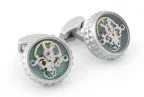 Die neueste Ergänzung unserer „Diamond Giza“-Kollektion sind diese eleganten Tourbillon-Manschettenknöpfe. Das Tourbillon ist ein aufwendig gefertigter Mechanismus, der in Luxusuhren eingesetzt wird, um den Einfluss der Schwerkraft auf die Kalibrierung auszugleichen und so die Ganggenauigkeit zu verbessern. Wählen Sie zwischen einem Palladiumgehäuse mit handbemaltem, blauem Emaille-Hintergrund.