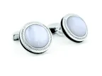 Smooth white mother of pearl/ Sodalite domes sit mitin our round, rhodium plated sterling silver frame, mit an engraved diamond pattern und schwarz-coloured enamel edge to accentuate the beauty of each semi-precious stone. Decorate your sleeve mit one of our stones of the world.The colour und natural formation of our gemstones differs from one another due to natural variation, making each piece truly one of a kind. The face of each cufflink measures 18mm length x 18mm height x 6mm width.