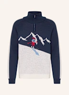 WE NORWEGIANS Troyer AFTERSKI aus Merinowolle: DUNKELBLAU / HELLGRAU / ROT