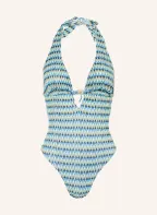 BANANA MOON COUTURE Strój kąpielowy MIRAGE NEREA z wiązaniem na szyi i błyszczącą nicią: NIEBIESKI / JASNONIEBIESKI / BIAŁY
